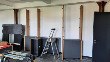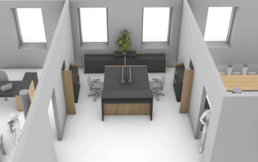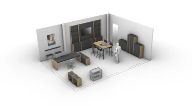 Materialeinsatz, Gestaltung und Details halten sich die Waage aus repräsentativem Charakter und genossenschaftlicher Zurückhaltung. Prägend ist die Konzentration auf das Wesentliche. So tragen die Korpusse eine ultra-matte, vor Fingerabdrücken schützende Beschichtung, auf Griffe wurde verzichtet. Ergänzt wird das Ganze durch ein passendes Regalsystem und einen flexibel nutzbaren Besprechungstisch, der zusammen mit dem passenden Schreibtisch das Bild komplettiert.